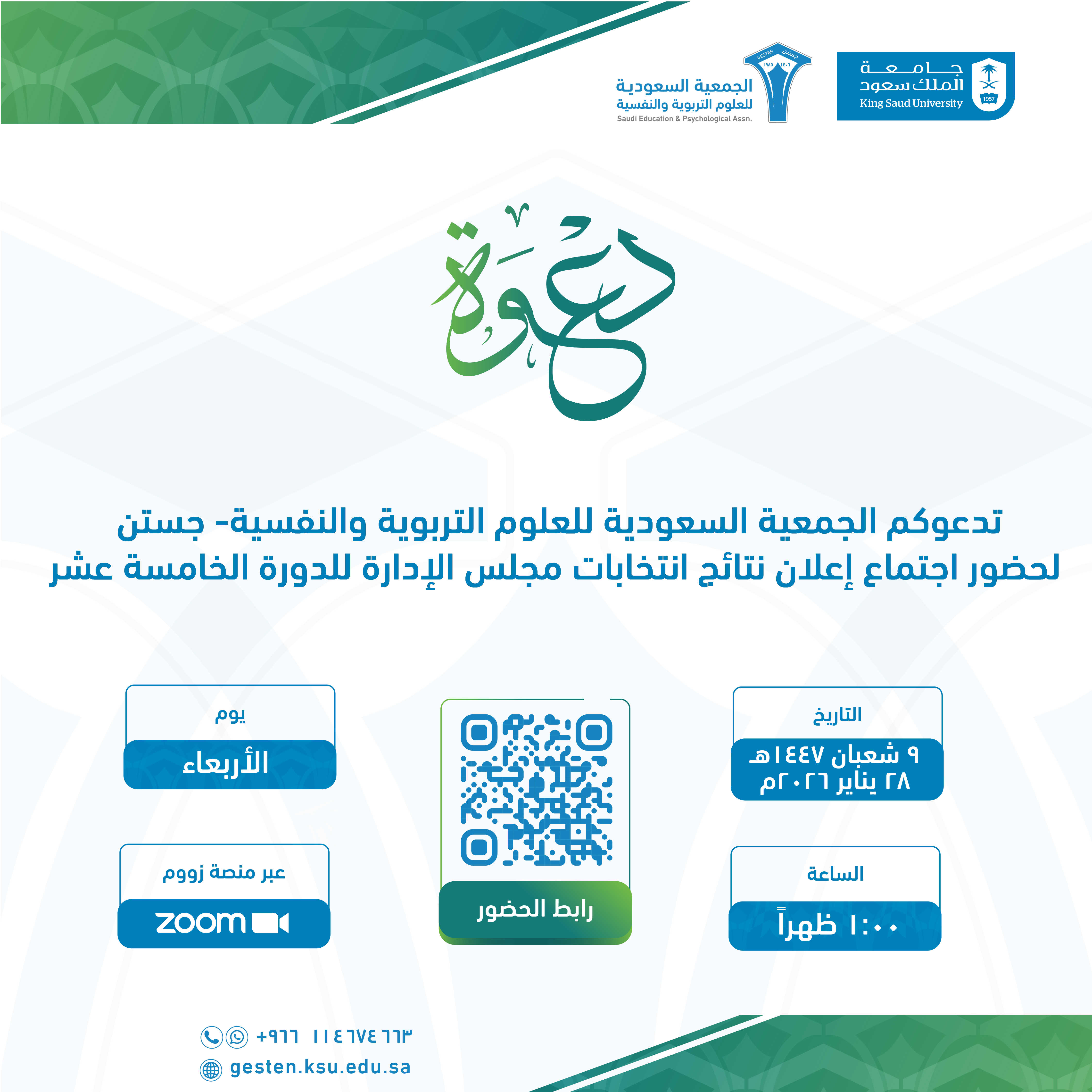 تدعوكم الجمعية السعودية للعلوم التربوية والنفسية- جستن لحضور اجتماع إعلان نتائج انتخابات مجلس الإدارة للدورة الخامسة عشر بمشيئة الله تعالى – في